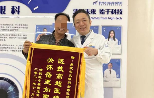 近日,杭州未来科技城医院眼科团队收到一面锦旗。患者黄先生与眼科主任吴玉伟合影留念时笑容满面。 62岁的黄先生家住余杭区中泰街道,11月中旬在杭州未来科技城医院进行了白内障手术,右眼视力从0.1恢复至0.8,对此很是满意。 此前,黄先生...